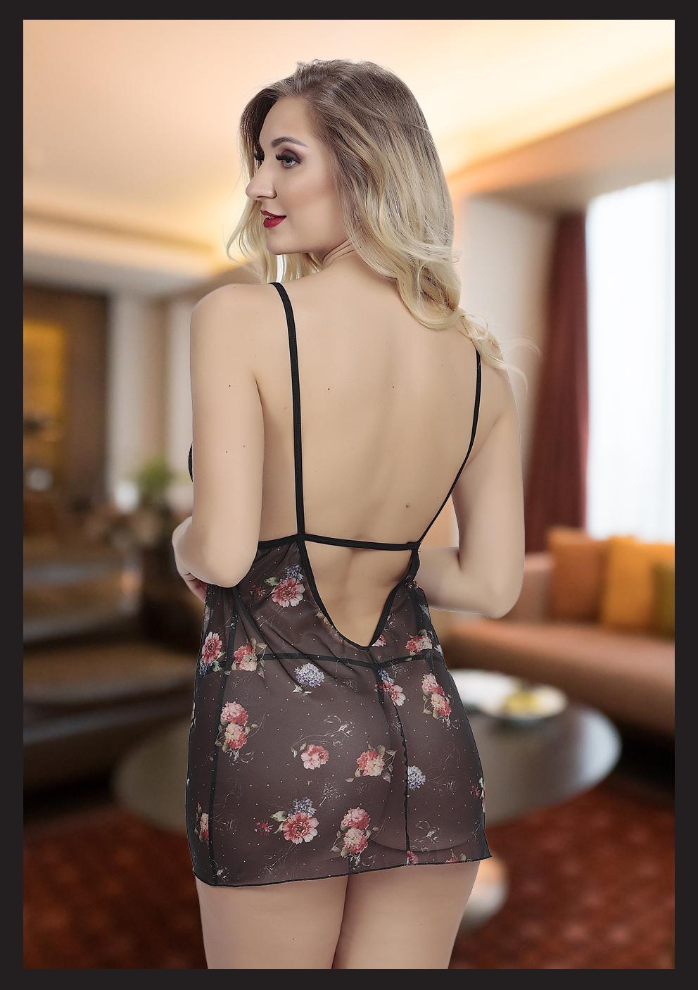 📦 Ürün İçeriği 1 adet dantel ve floral desen detaylı, derin sırt dekolteli transparan mini gecelik.